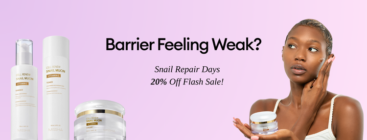 The video opens with a minimal, bright background. A hand lifts the first skincare product into frame. On-screen text appears: “ASCORBIC ACID | VitaC™ | MISSHA.”
