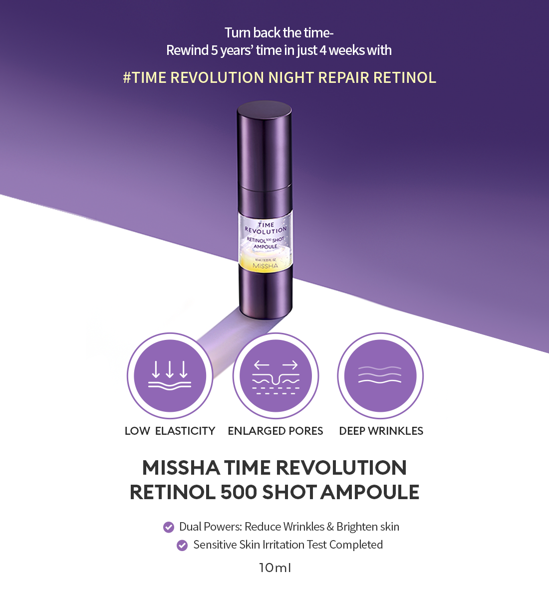 Wake up to younger, more radiant skin every morning. Time Revolution Night Repair Retinol Intensive Ampoule is our new and improved overnight probiotic treatment. Introducing RETINOL SHOT™: Missha’s unique stabilizing formula of pure retinol + retinol-boosting ingredients to repair the skin barrier and fortify retinol’s age-defying properties. This ultra-nourishing serum is also infused with the classic Night Repair formula Extreme Biome™, a combination of 10 potent probiotics for rapid results.