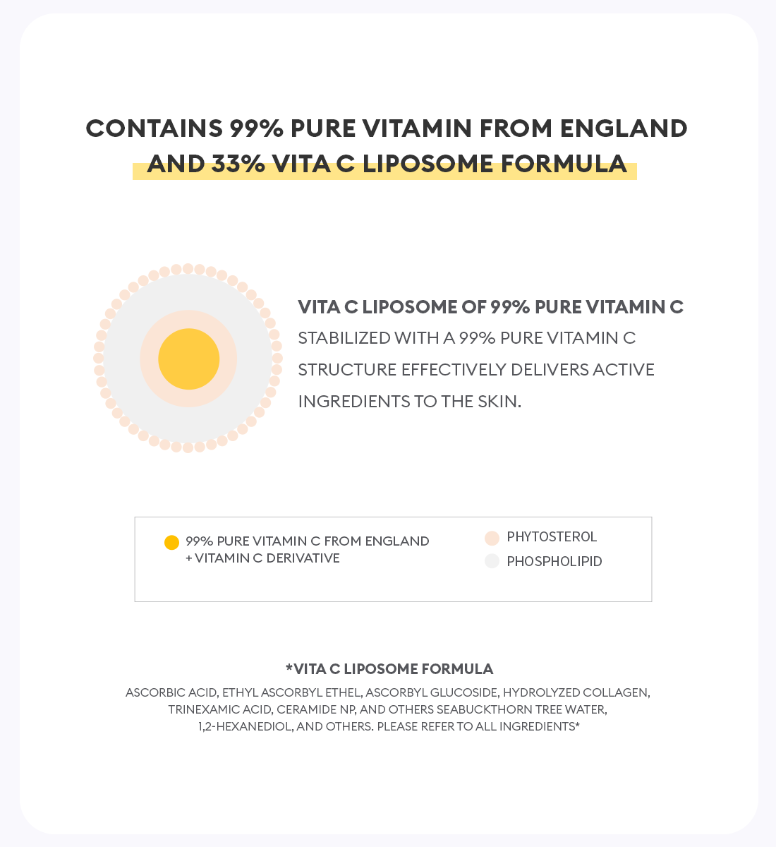 Vita C Liposome Formula: containing 99% pure Vitamin C from England, including stable forms of the antioxidant in the forms of Ascorbic Acid, Ethyl Ascorbyl Ether, and Ascorbyl Glucoside, to treat and prevent changes associated with skin aging